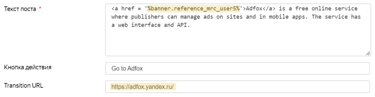 In the example below, an impression will occur with the %banner.reference_mrc_user5% variable being replaced with the https://adfox.yandex.ru link: