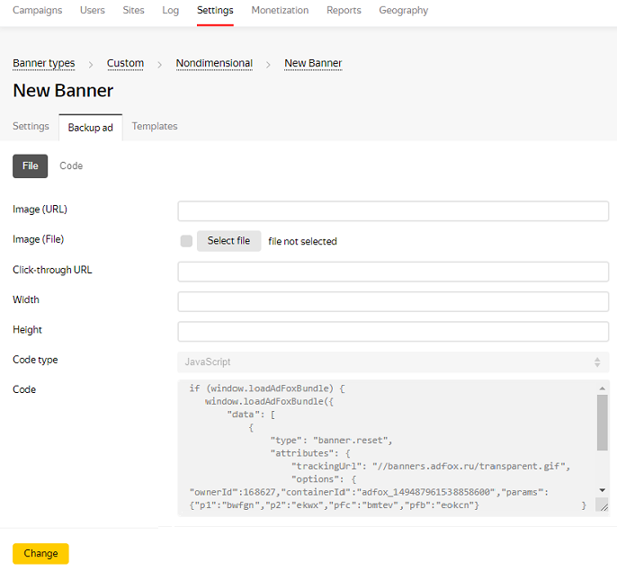 Please note that when the banner is saved, the parameters of the re-request code will be wrapped in quotation marks in a special way. That is necessary for the code to work properly. Don't change the resulting code after saving the banner.