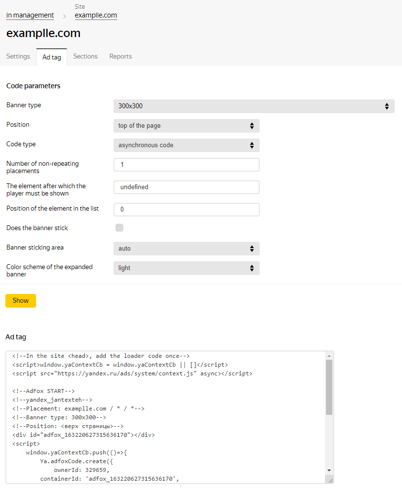 Parameters for adding a banner to Adfox: