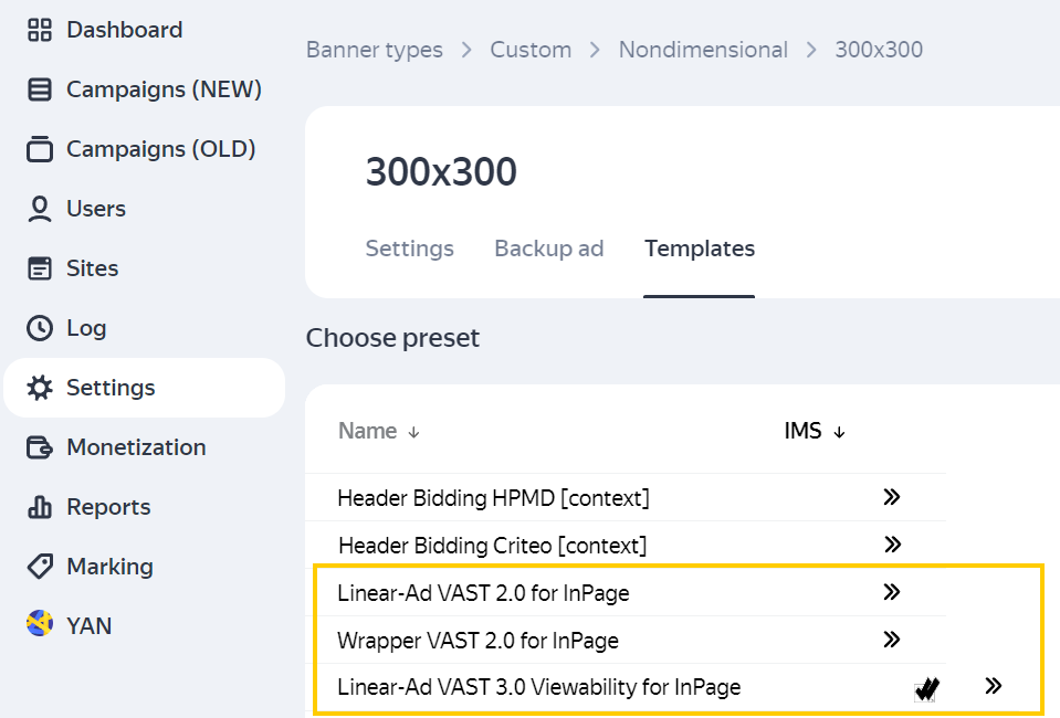 - Viewable impression, Yandex is only available in the Linear-Ad (Pre / Mid / Post-roll) VAST 3.0 Viewability for InPage template.