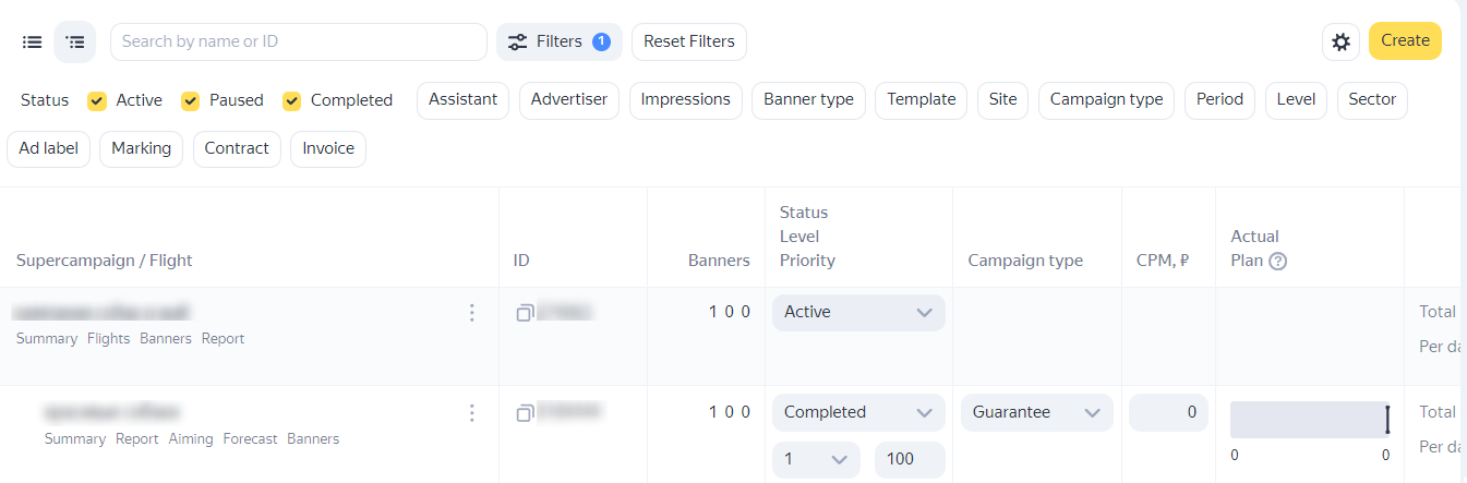 To see the campaigns and flights that match specific parameters, click Filters and select the desired values. To restore the full list, click Resert Filters.