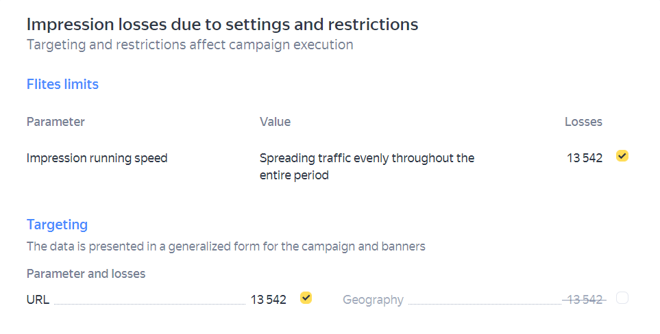 The list contains the potential number of impressions that the campaign loses due to these limits or targetings: