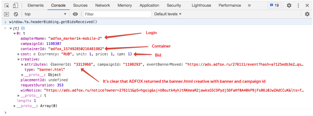 • Make sure that a creative with a bid is received for the login and the container from Step 1.