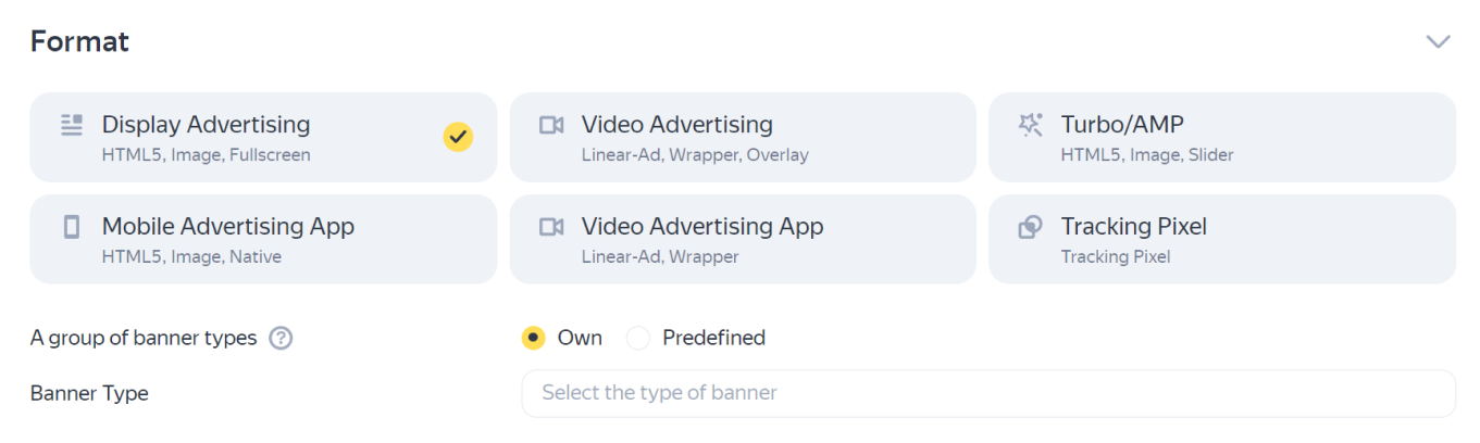 In a campaign with the impression count methods Impression (IMS), Viewable Impression (IMS), and Viewable impression, Yandex (IMS), you can only add banners with templates that have “IMS” in their names.