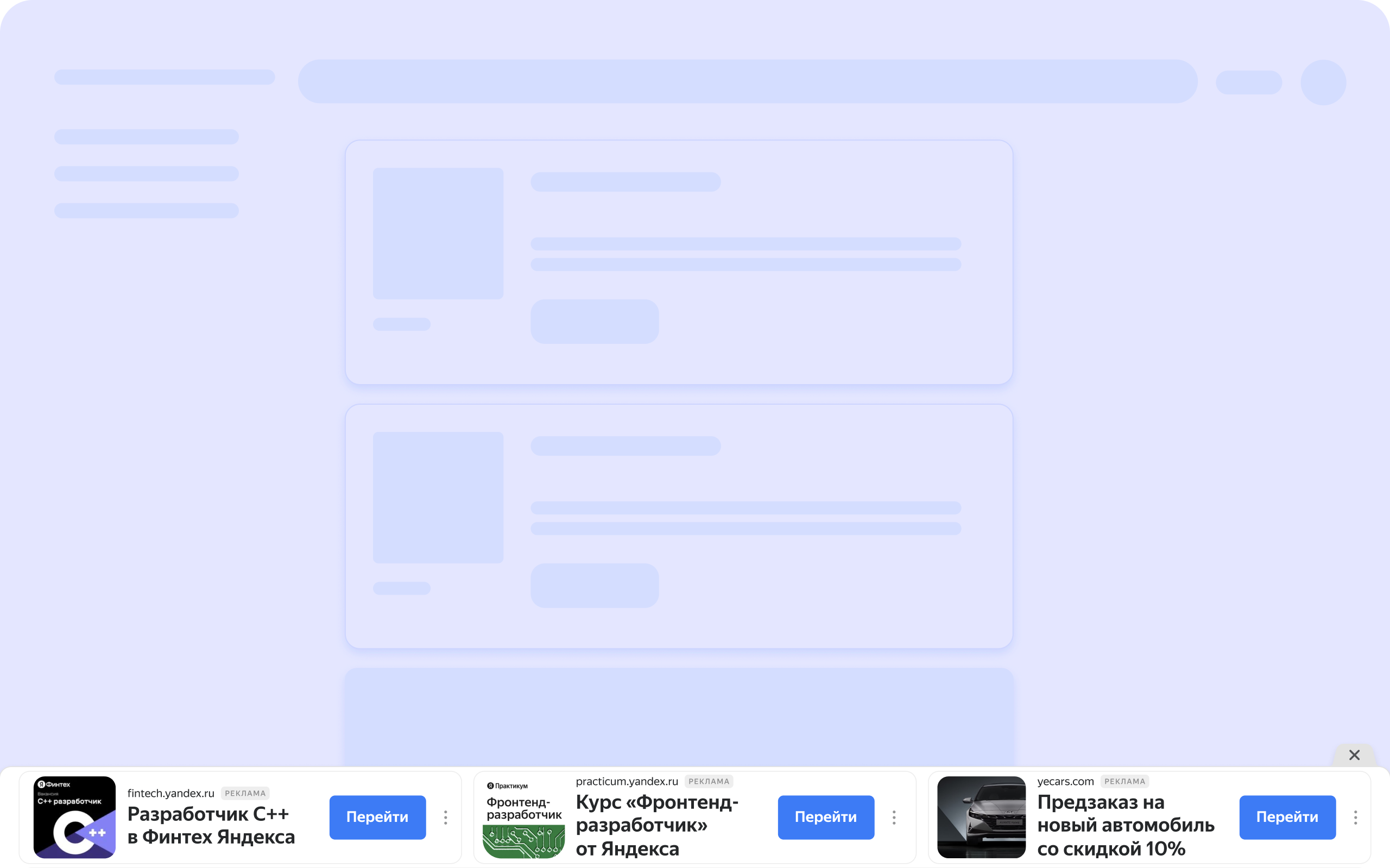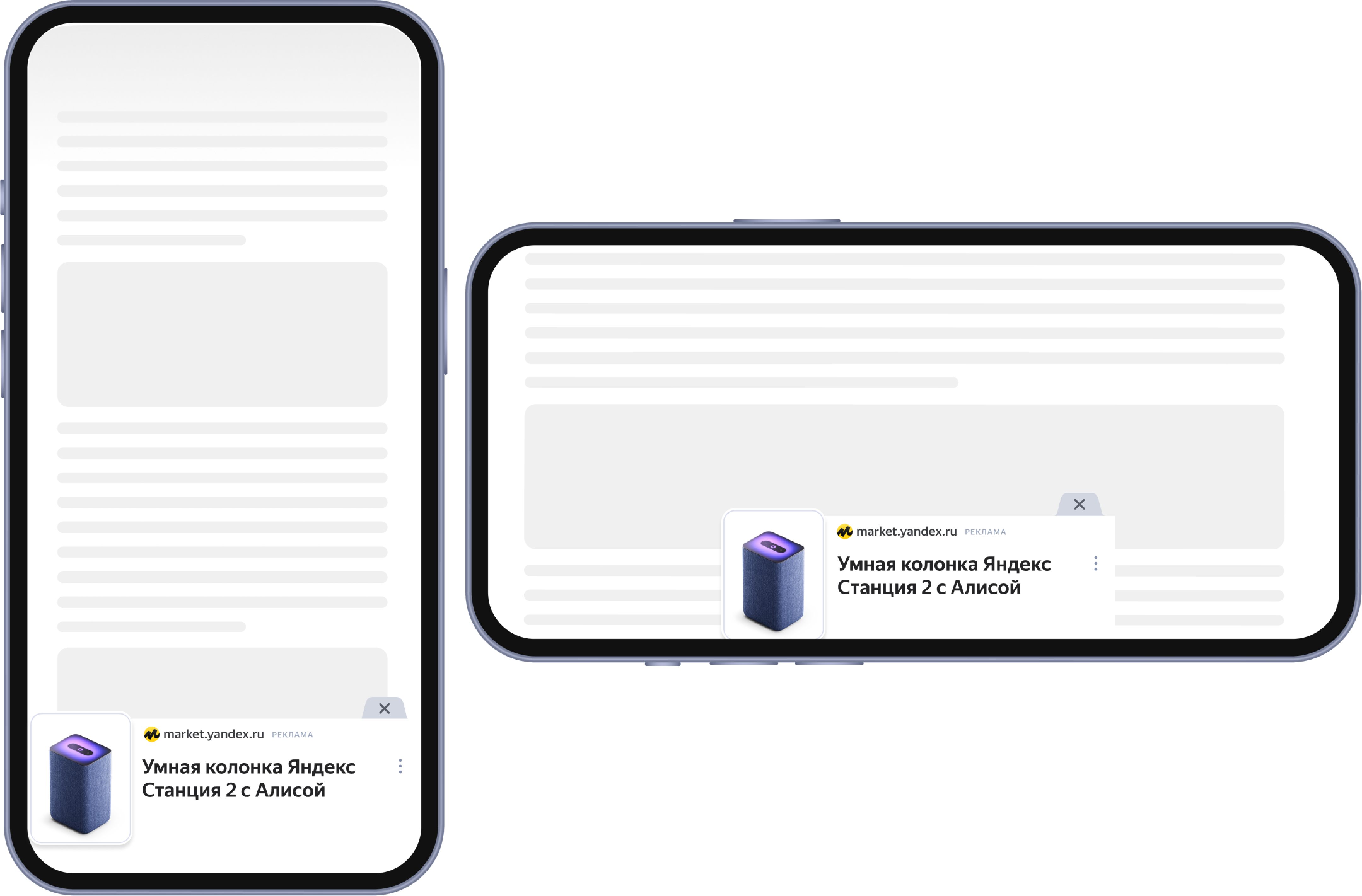 Adfox позволяет отрисовать баннеры в блоке Floor Ad как в мобильной, так и в десктопной версии сайта. В блоке можно показывать рекламу из Рекламной сети Яндекса и внешних монетизаторов, а также прямые продажи или собственное промо. При этом дополнительные обертки не нужны: все необходимые элементы рекламы Floor Ad (кнопка Закрыть, подложка) будут добавлены автоматически.