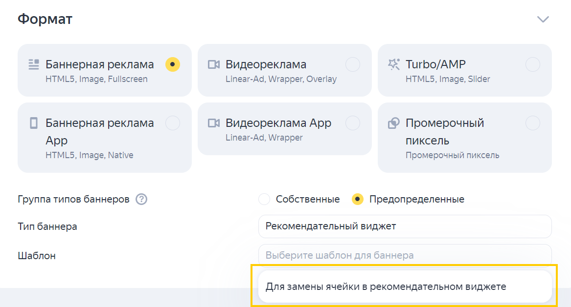 Добавьте баннер типа Рекомендательный виджет и выберите шаблон Для замены ячейки в рекомендательном виджете.
