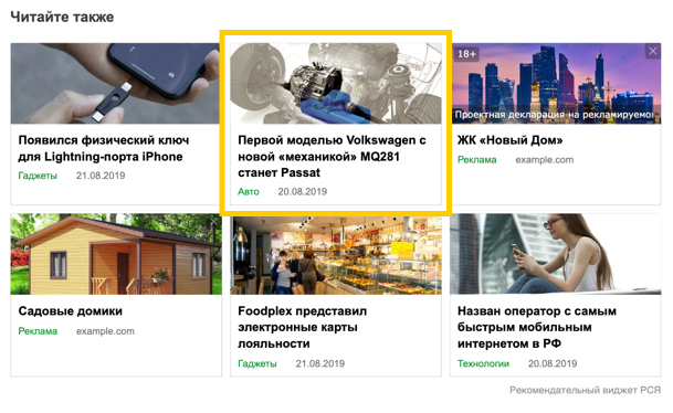 Позиция ячейки считается от левого верхнего угла. В примере ниже под рекламу отведена третья и четвертая ячейки рекомендательного виджета. Если в параметрах баннера задана, например, вторая позиция, он займет эту позицию, а рекомендация с этой ячейки сдвинется вправо вместе с остальными.