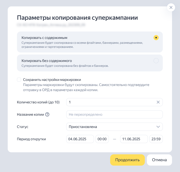 Название копии — при необходимости укажите название копии кампании. Поле можно оставить пустым — копия получит название исходной кампании с пометкой «копия».