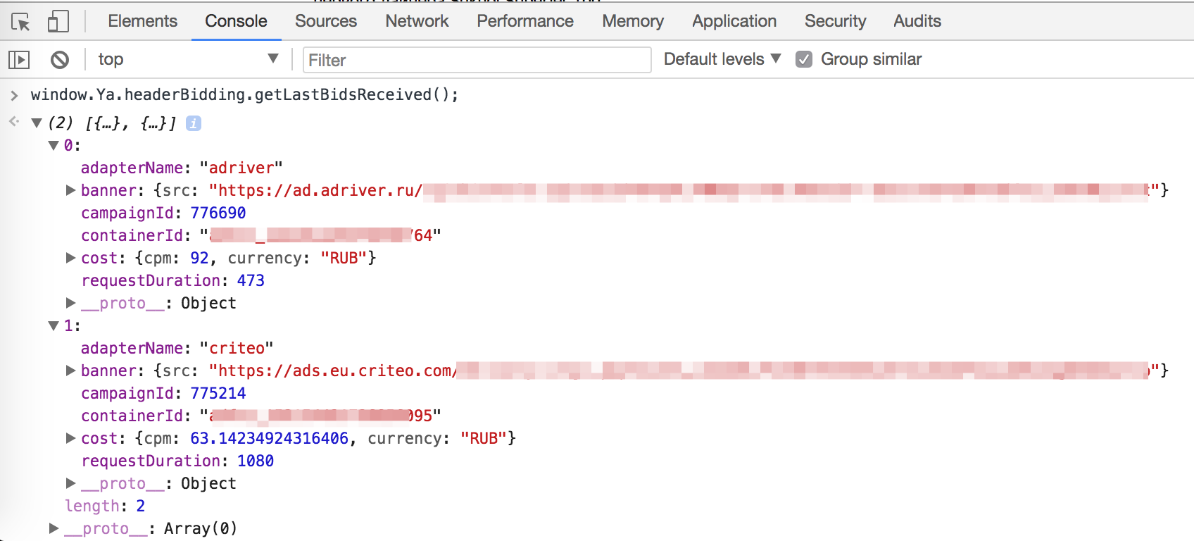Чтобы получить ставки с последнего опроса монетизаторов, воспользуйтесь рекламной консолью или используйте метод getLastBidsReceived в консоли браузера: