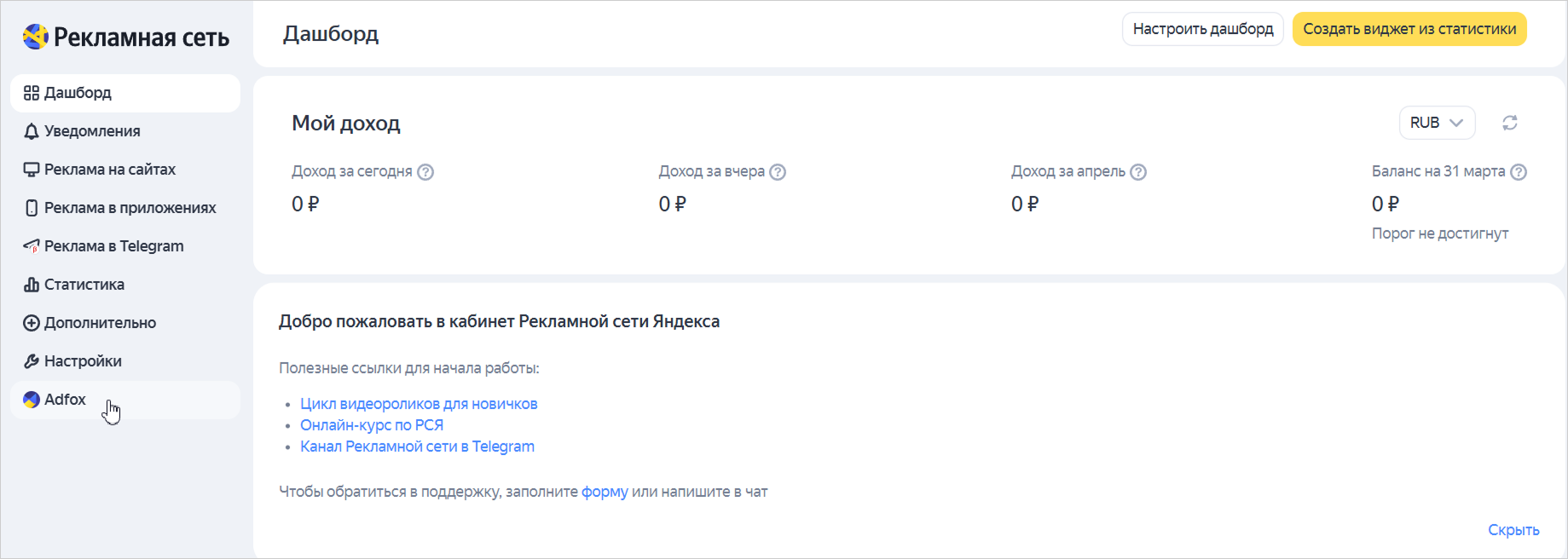 1. Добавьте сайт в интерфейсе Рекламной сети Яндекса. После добавления ресурс автоматически отправится на модерацию. После того, как ваш ресурс пройдет модерацию, можно подключать Рекламную сеть в Adfox.